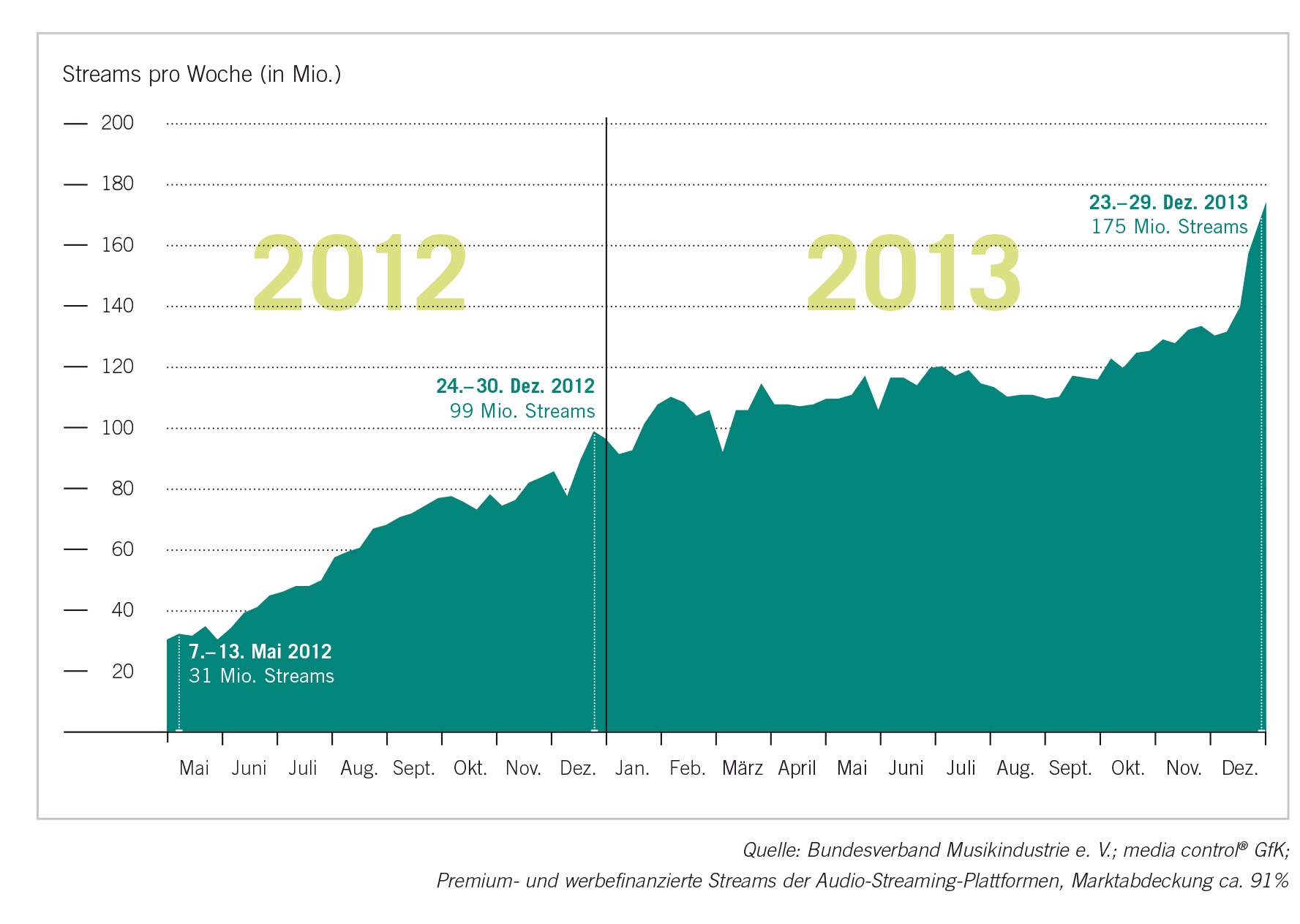 Seit 2012 und dem Start des Streaming-Dienstes Spotify zeichnet sich jedoch noch ein anderes Bild ab. Im vergangenen Jahr steigerten sich die Wachstumsraten der Streaming-Angebote für Musik um 54%, während CD und Download-Portale einen Abwärtstrend verzeichnen müssen.